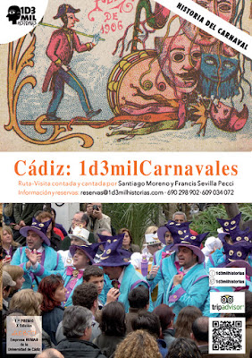 Dos motivos, principalmente, nos ha llevado a Francis Sevilla y un servidor a presentar una nueva ruta cuyo eje central es la Historia del Carnaval en Cádiz. Por un lado el pasado mes de julio hemos cumplido un año desde que comenzáramos "Cádiz en posguerra". Por otro, no existe en la ciudad una ruta que explique al aficionado, al curioso o al visitante cuando surgió nuestro Carnaval; qué modalidades de agrupaciones lo conforman; por qué existe un concurso de coplas; etc,.